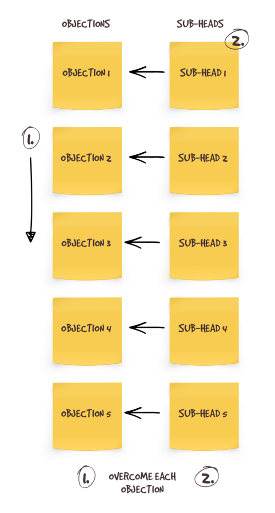 - Write a sub-headline that sells the reader on overcoming each objection (right column),
