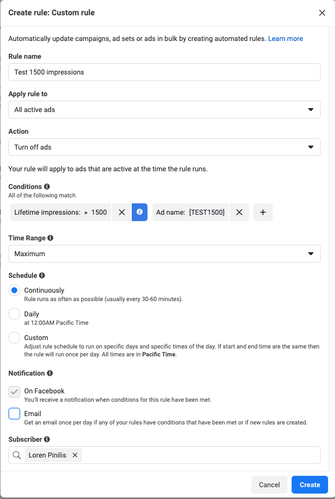 Let’s say our impression goal is 1500 impressions. We have an automated rule setup to turn off the ads when they reach 1500 impressions as long as the ad contains [TEST1500] in the ad name.