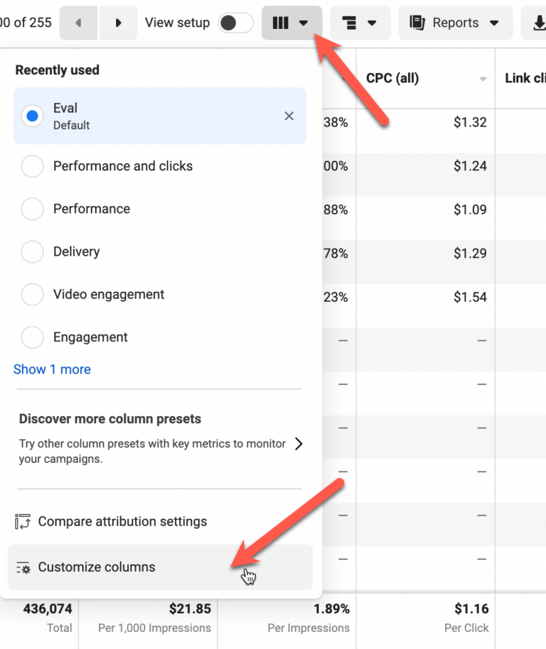 In Ads Manager, we have the ability to customize our columns and save various presets. There’s no right or wrong way to do this. I normally like to use one single dashboard with lots of data.
