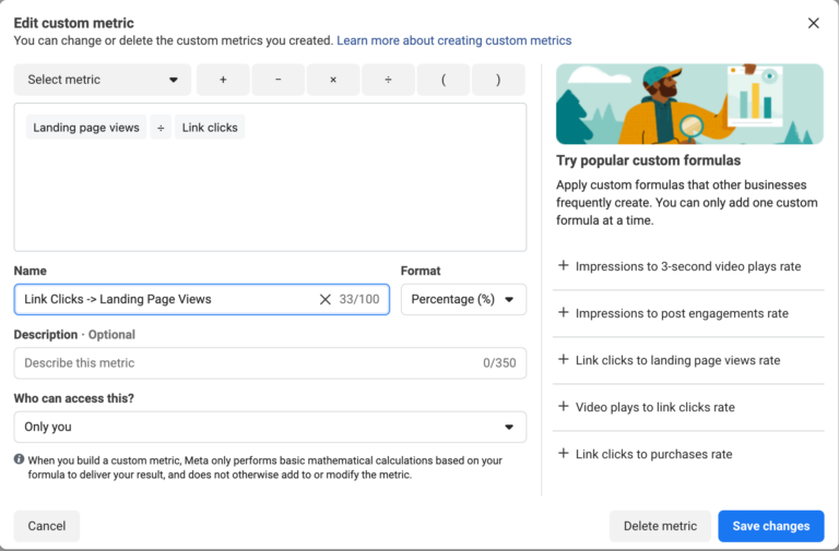 One quick tip: name your custom metric something like “Link Clicks -> Landing Page Views” instead of “Conversion Rate.” As we add more metrics, that bit of clarity will be helpful.