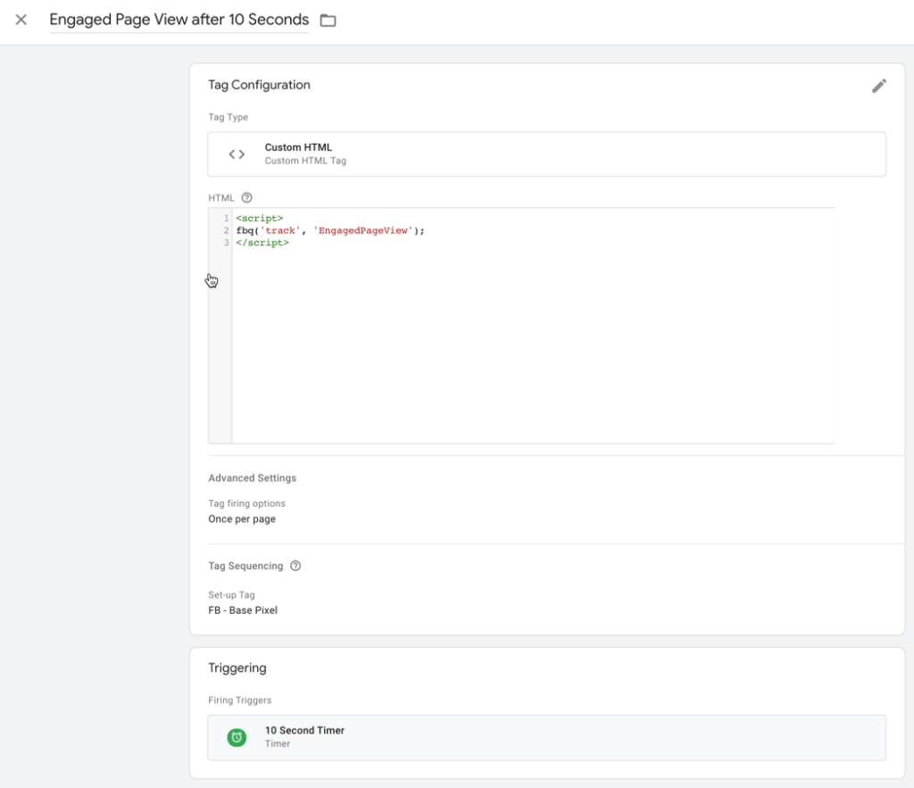 This gives us a little glimpse into who sticks around and engages with the page for a few seconds. Feel free to play with this and make it your own — you could fire multiple pixel events, you could use page scroll instead of timers, and you could set the timer length to a different time period. The possibilities are endless.